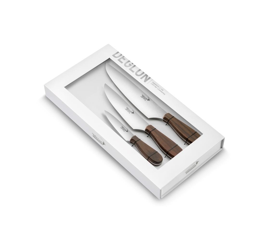 It includes 3 iconic knives - 3 essentials for all your culinary preparations : 10 cm paring knife / 15 cm utility knife / 20 cm chef's knife.